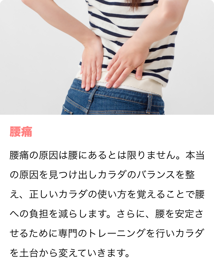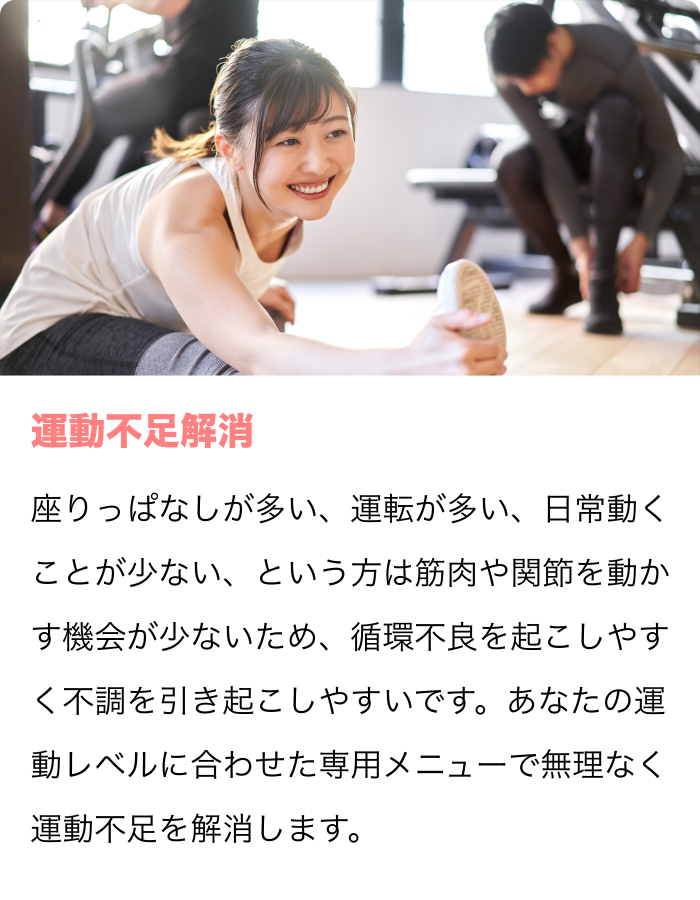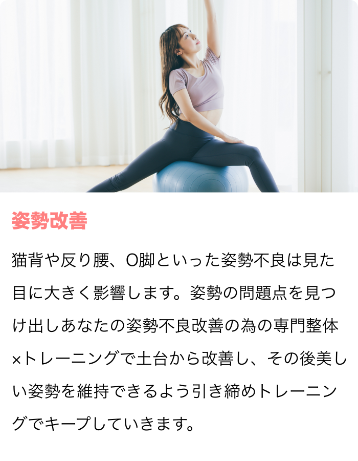 トレーニングだけでなく、あなたのお身体の状態に合わせて全身調整や骨盤矯正、機能改善エクササイズを組み合わせるため、より詳細にお悩みの改善方法のご提案が可能です。遠慮なくご相談ください。